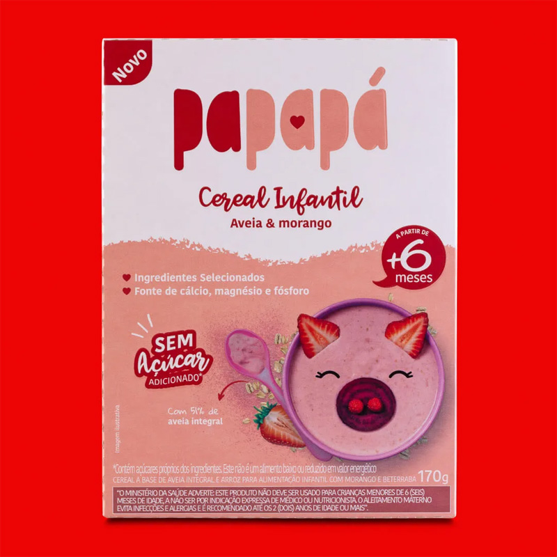 O Cereal Infantil de Aveia e Morango da Papapá é de preparo instantâneo, com zero açúcar adicionado.