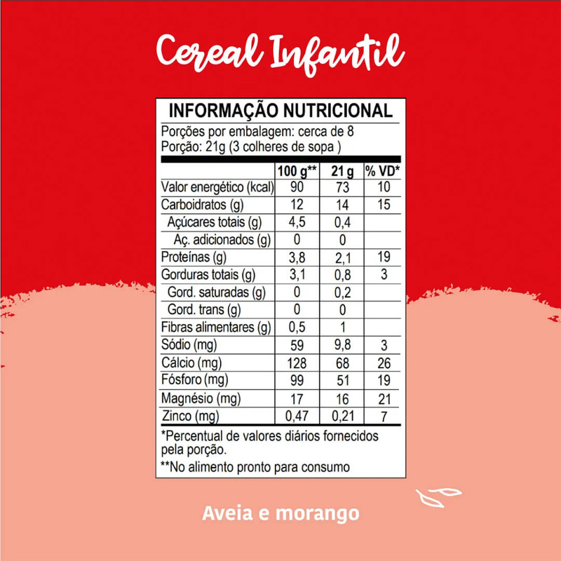 | Farinha de aveia integral (51%), farinha de arroz (43%), flocos de morango, beterraba em pó e fosfato tricálcico (cálcio). |