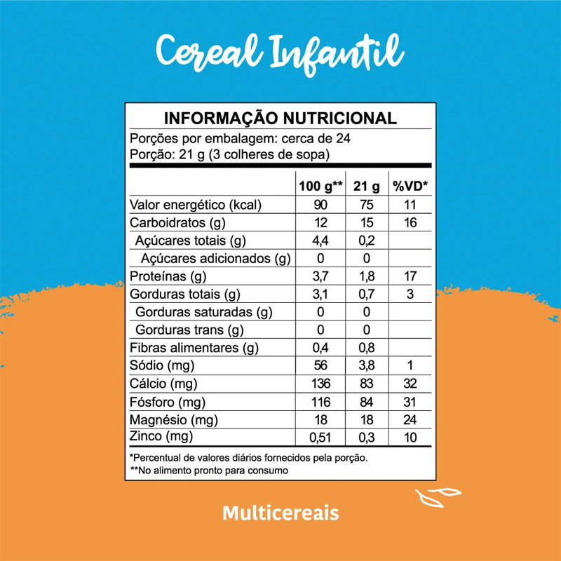 | O Cereal Infantil de Multicereais é comercializado em uma embalagem de 170g, que rende até 8 porções. |