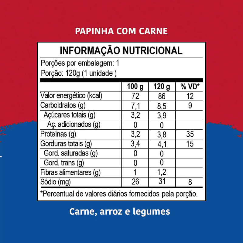 | Feita apenas com ingredientes naturais, nossa Papinha de carne, arroz e legumes é uma refeição completa que contém os 4 principais grupos alimentares (proteína, cereais/grãos, vegetais e gordura), ela é perfeita para momentos onde você precisa de praticidade e não quer abrir mão da qualidade na alimentação do seu bebê! Além disso, ela é: