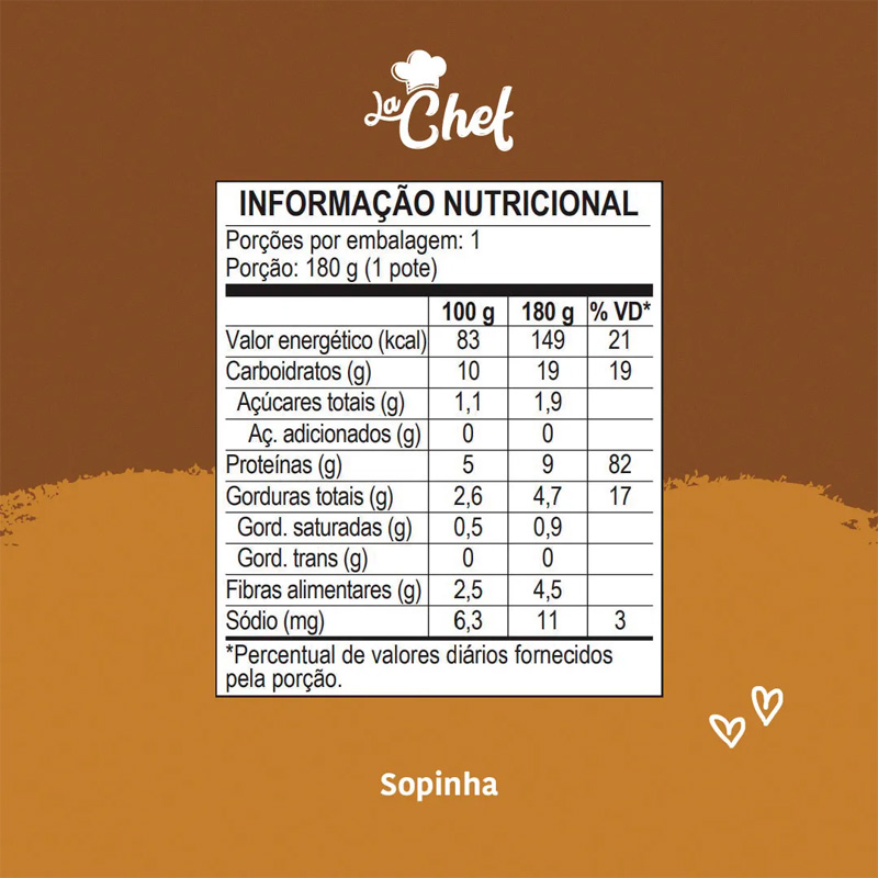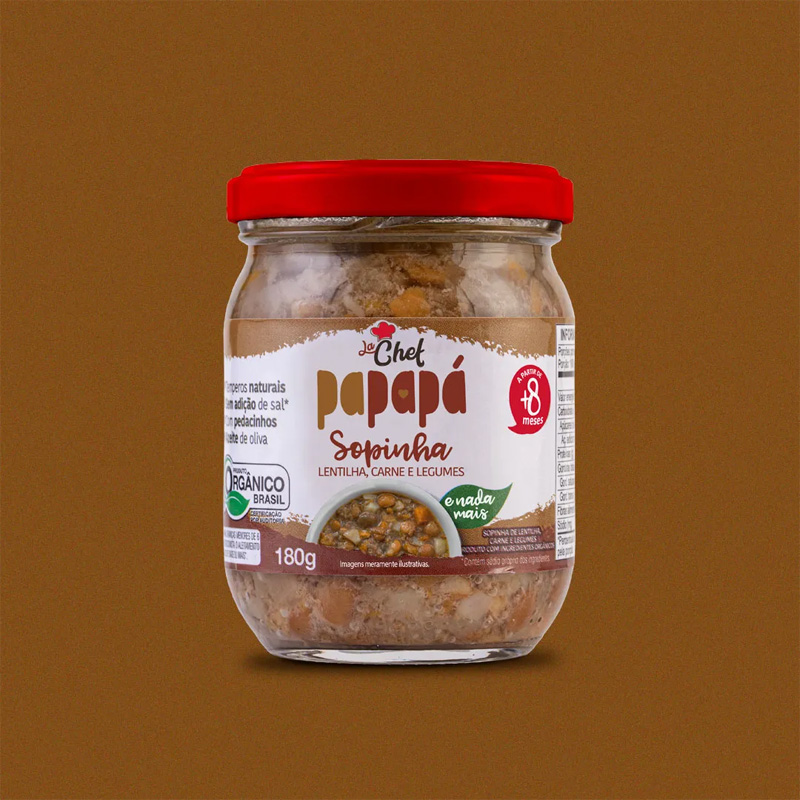 Em menos de 1 minuto ofereça com segurança uma refeição gourmet feita apenas com ingredientes naturais e orgânicos, sem sal adicionado e nenhum tipo de conservante, corante ou aromatizante. A Sopinha possui: lentilha, carne, legumes e temperos naturais. |